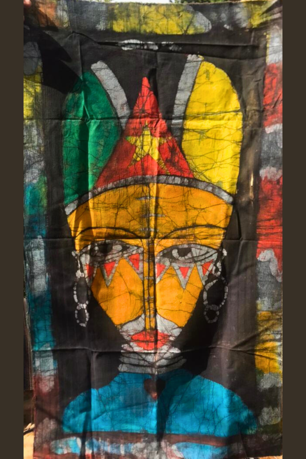 The “crackle” of the wax resist creates a topographic map of time across her face, suggesting a wisdom that predates the medium itself. With a crown bearing the star of Mozambique, she stands as a pillar of sovereignty. The symmetry of her gaze—framed by ceremonial red geometry and weighted by the rings of her neck—demands a specific kind of silence from the viewer. It is the silence of respect.